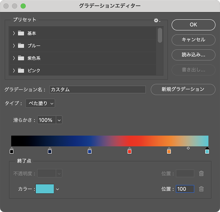 グラデーションエディターが表示されたら、グラデーションサンプルのカラー分岐点を設定して黒、濃い青、青、赤、オレンジ、水色のグラデーションを作成して適用する(図11)(図12)。