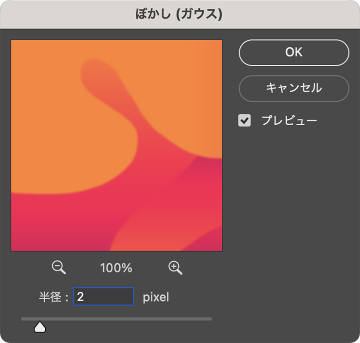 微調整してグラフィックを仕上げていく。レイヤーメニュー→“画像を統合”を実行してすべてのレイヤーを背景レイヤーにまとめたら、フィルターメニュー→“ぼかし”→“ぼかし(ガウス)...”を[半径:2pixel]で適用する(図18)(図19)。