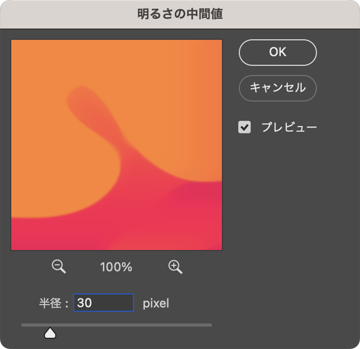 続いて、フィルターメニュー→“ノイズ”→“明るさの中間値...”を[半径:30pixel]程度で実行し、模様の曲線部分をより滑らかにする(図20)(図21)。