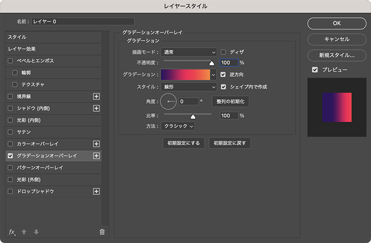 最後にレイヤーパネルで背景レイヤーをダブルクリックして「新規レイヤー」ダイアログを開き、[OK]をクリックして通常のレイヤーに変換したあと、レイヤーメニュー→“レイヤースタイル”→“グラデーションオーバーレイ...”を[描画モード:通常]、[不透明度:100%]、[グラデーション:赤_07]、[スタイル:線形]、[角度:0°]、[逆方向]にチェックを入れて適用する(図16)(図17)。