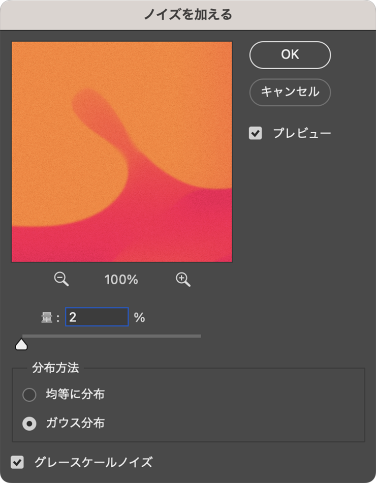 さらに、フィルターメニュー→“ノイズ”→“ノイズを加える...”を[量:2%]、[分布方法:ガウス分布]、[グレースケールノイズ]にチェックを入れて適用し、ザラッとした質感をつける(図22)(図23)。
