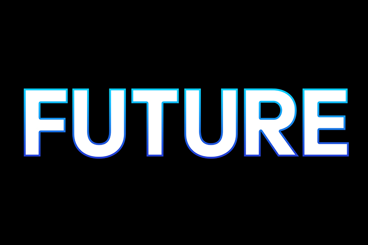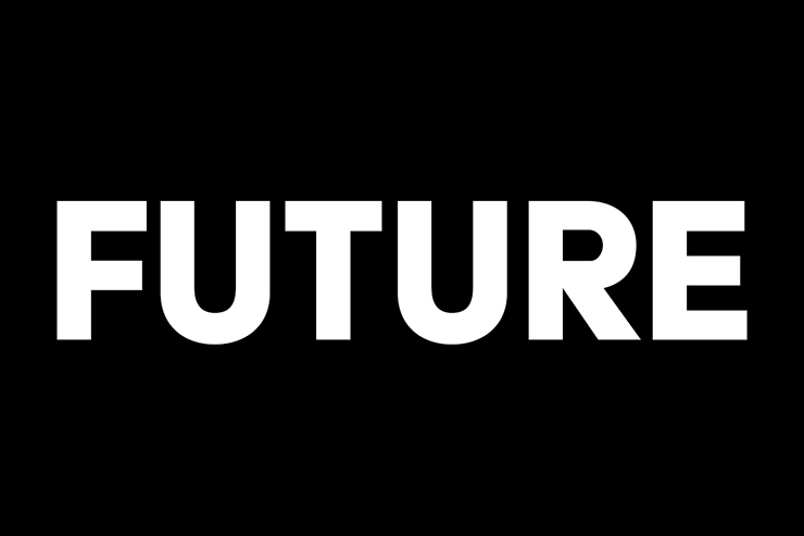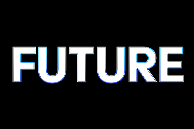まずは新規ファイルを[幅:1200ピクセル]、[高さ:800ピクセル]、[解像度:350ピクセル/インチ]、[カンバスカラー:黒]で作成したら、横書き文字ツールで元になる文字(ここでは「FUTURE」)を入力し、文字パネルでフォントやフォントサイズなどを設定(図1)。今回はレトロフューチャー感を出したいので、フォントは幾何学的なフォルムが印象的なサンセリフ体「Acier BAT」(Production Type)を選択した。