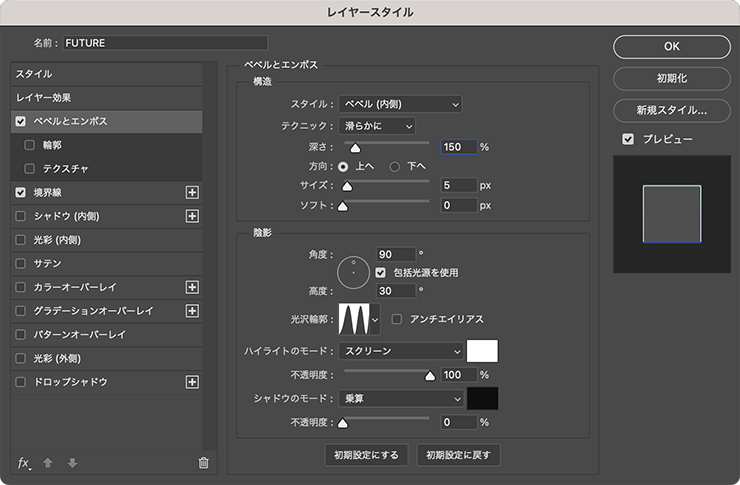 続いてレイヤースタイルの[ベベルとエンボス]を選び、[スタイル:ベベル(内側)]、[テクニック:滑らかに]、[深さ:150%]、[方向:上へ]、[サイズ:5px]、[ソフト:0px]、[角度:90°]、[高度:30°]、[光沢輪郭:リング - 二重]、[ハイライトのモード:スクリーン]、[ハイライトのカラー:白]、ハイライトの[不透明度]を100%に、[シャドウのモード:乗算]、[シャドウのカラー:黒]、シャドウの[不透明度]を0%に設定する(図8)(図9)。