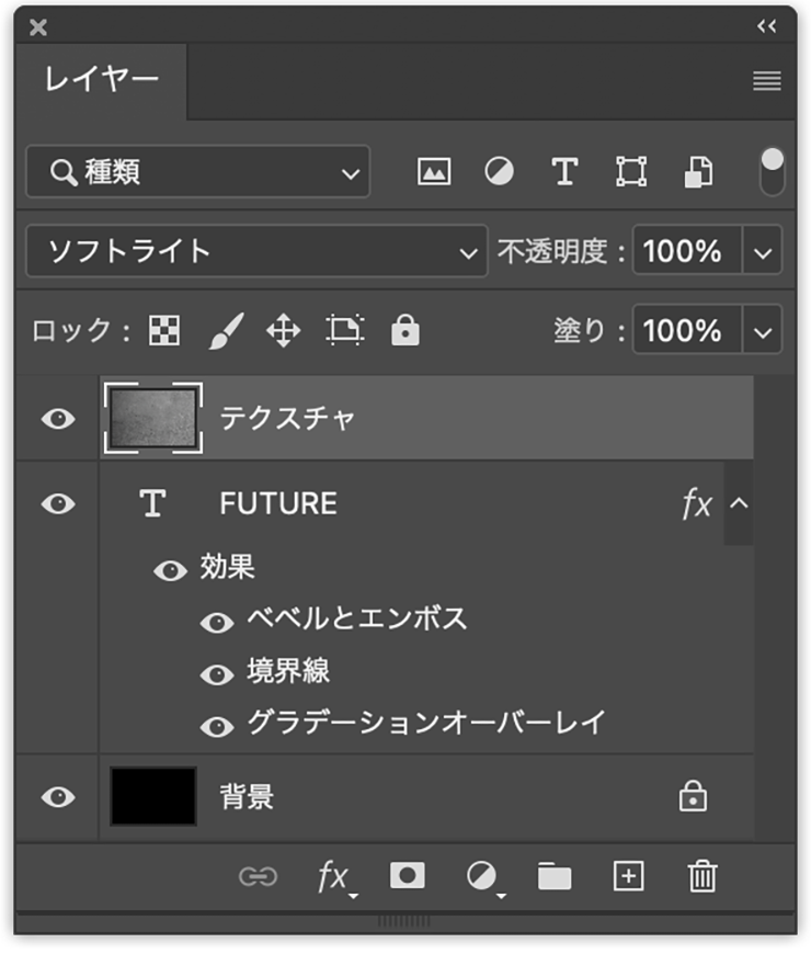■使用する機能「横書き文字ツール」「境界線」「ベベルとエンボス」「グラデーションオーバーレイ」「描画モード」「レベル補正」