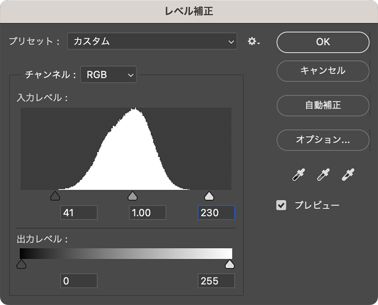 テクスチャ素材のレイヤーを選択した状態のまま、イメージメニュー→“色調補正”→“レベル補正...”を選び、シャドウとハイライトのスライダーを動かしてコントラストを強めておく(図16)(図17)。ここでは[シャドウ:41]、[ハイライト:230]としたが、表現したいイメージによっても最適な数値は異なるのでプレビューを見ながら調整してみてほしい。