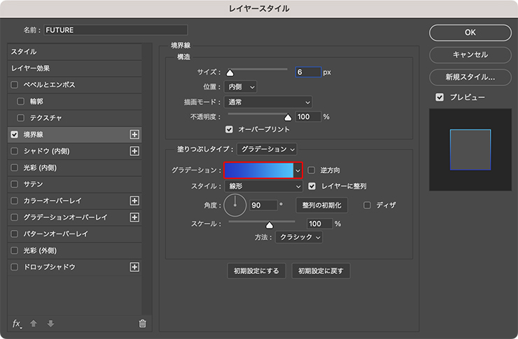 文字にグラデーションをかけていく。レイヤーパネルで文字のレイヤーを選択したあと、レイヤーメニュー→“レイヤースタイル”→“境界線...”を選び、[サイズ:6px]、[位置:内側]、[描画モード:通常]、[不透明度:100%]、[塗りつぶしタイプ:グラデーション]、[スタイル:線形]、[角度:90°]に設定(図5)。さらに[グラデーション]のグラデーションサンプルをクリックしてグラデーションエディターを開き、カラー分岐点の左を青(ここでは16進数カラーコード[#263dd2])、右を水色(ここでは16進数カラーコード[#0dccff])に設定する(図6)(図7)。