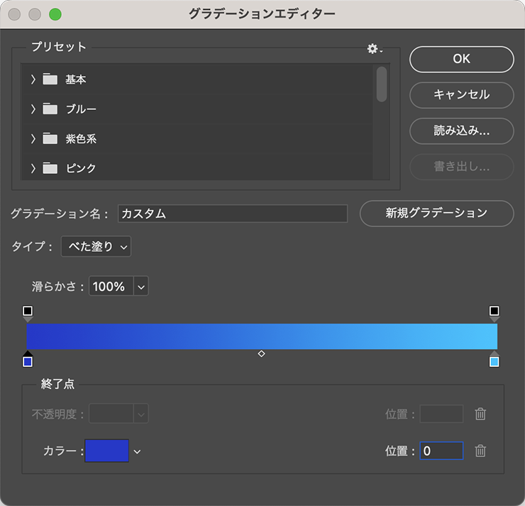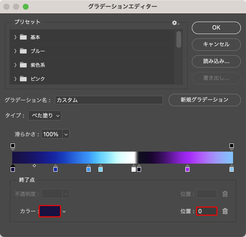 さらに[グラデーション]のグラデーションサンプルをクリックしてグラデーションエディターを開き、カラー分岐点を追加して寒色系のグラデーションを設定する。ここではカラー分岐点を6個追加して合計8個とし、左から濃紺([カラー:#1a0d4e]、[位置:0%])、紺([カラー:#122db4]、[位置:20%])、青([カラー:#00a2ff]、[位置:35%])、水色([カラー:#50dbff]、[位置:40%])、白([カラー:#ffffff]、[位置:55%])、黒に近い紫([カラー:#0f0b23]、[位置:58%])、紫([カラー:#ba00ff]、[位置:80%])、薄い青紫([カラー:#7cccff]、[位置:100%])に設定して適用した(図11)(図12)。