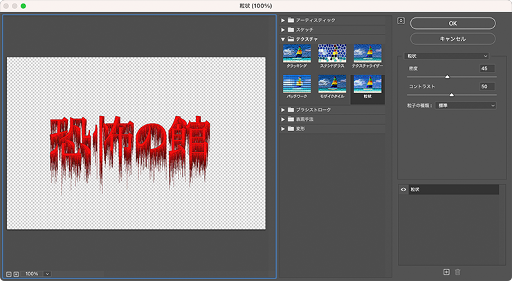 続いて、結合したレイヤーが選択された状態のまま、フィルターメニュー→“フィルターギャラリー...”を選び、[テクスチャ]の[粒状]を[密度:45]、[コントラスト:50]、[粒子の種類:標準]で適用する(図16)(図17)。