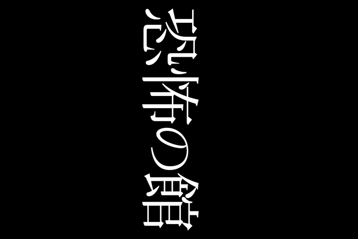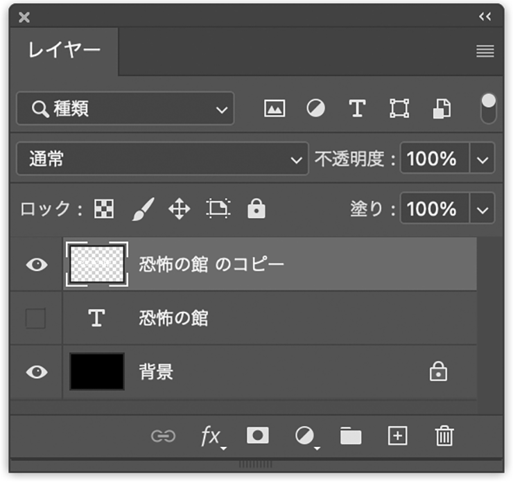 まずは新規ファイルを[幅:1200ピクセル]、[高さ:800ピクセル]、[解像度:350ピクセル/インチ]、[カンバスカラー:黒]で作成したら、横書き文字ツールで元になる文字(ここでは「恐怖の館」)を入力し、文字パネルでフォントやフォントサイズなどを設定(図1)。