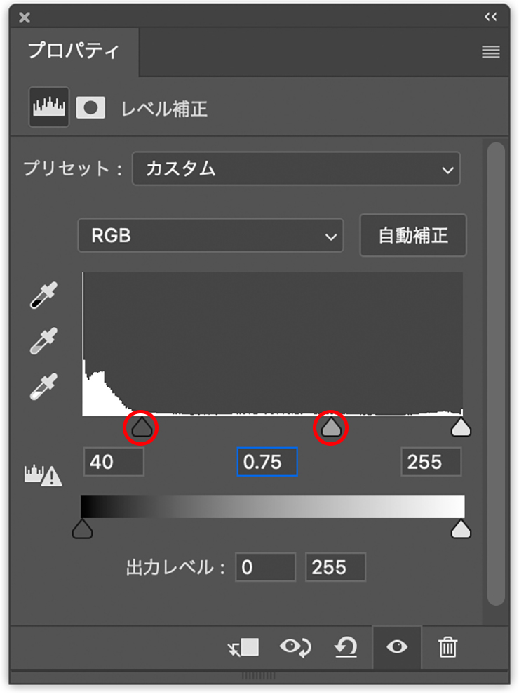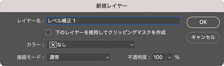 次に、レイヤーメニュー→“新規調整レイヤー”→“レベル補正...”を選択し、「新規レイヤー」ダイアログが表示されたら[OK]をクリック(図18)。プロパティパネルでシャドウと中間調のスライダーを動かしてコントラストを強める(図19)(図20)。ここでは[シャドウ:40]、[中間調:0.75]としたが、表現したいイメージによっても最適な数値は異なるのでプレビューを見ながら調整してみてほしい。