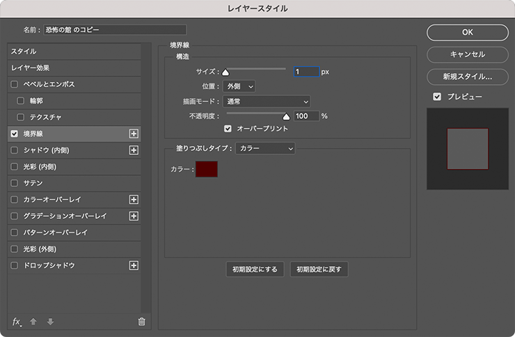 文字に色を着けていく。複製した方の文字レイヤーを選択した状態のまま、レイヤーメニュー→“レイヤースタイル”→“境界線...”を選び、[サイズ:1px]、[位置:外側]、[描画モード:通常]、[不透明度:100%]、[塗りつぶしタイプ:カラー]、[カラー]をワインレッド(ここでは16進数カラーコード[#4e0000])に設定する(図9)。