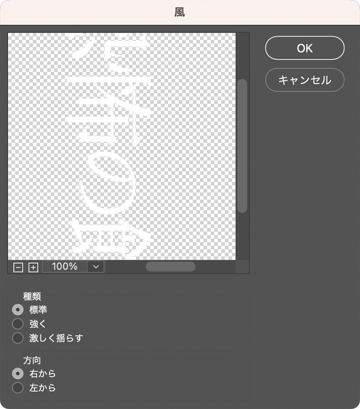 さらに“風…”フィルターを同じ設定で2回適用したら(図6)(図7)、編集メニュー→“変形”→“90°回転(反時計回り)”を実行して文字の向きを元通りにする(図8)。