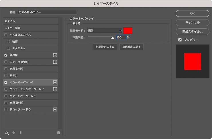続いてレイヤースタイルの[カラーオーバーレイ]を、[描画モード:通常]、[オーバーレイのカラー]を赤(ここでは16進数カラーコード[#ff0000])、[不透明度:100%]で適用する(図10)(図11)。