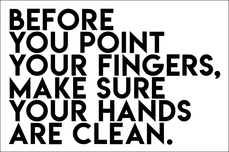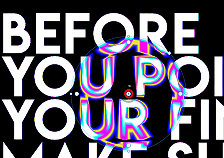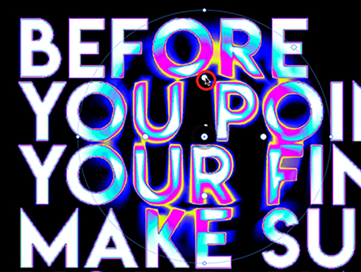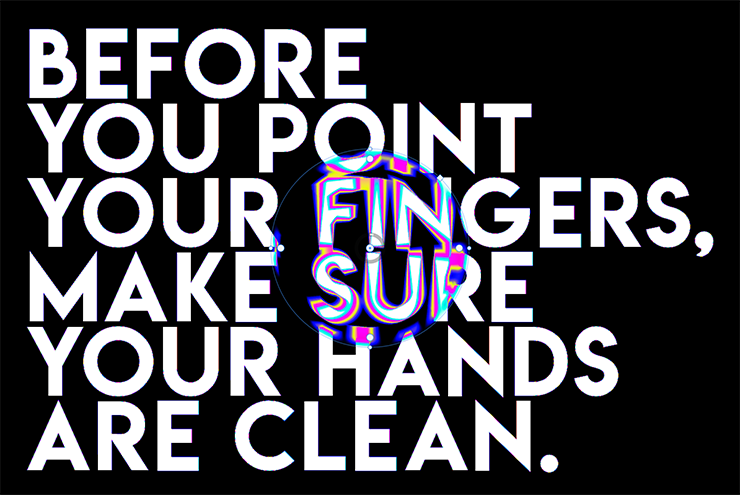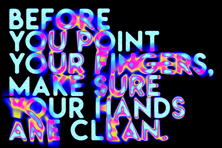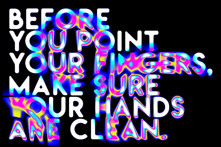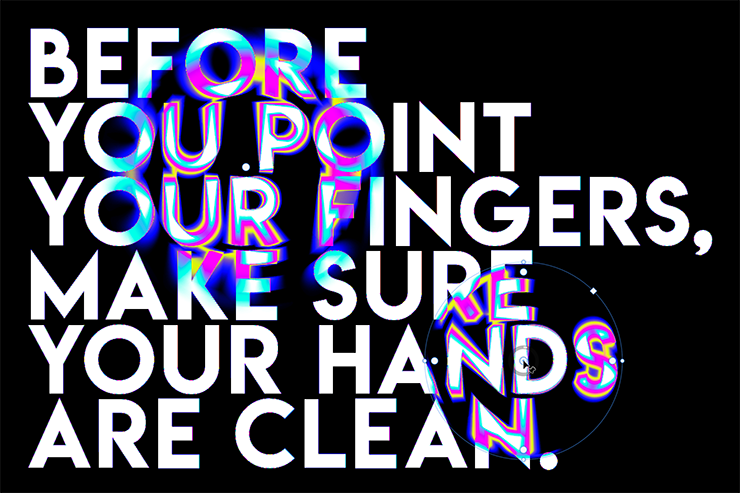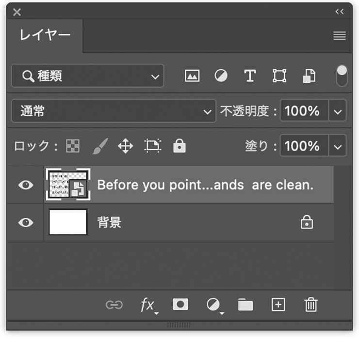 まずは新規ファイルを[幅:1200ピクセル]、[高さ:800ピクセル]、[解像度:350ピクセル/インチ]で作成したら、横書き文字ツールで元になる文字(ここでは「BEFORE YOU POINT YOUR FINGERS, MAKE SURE YOUR HANDS ARE CLEAN.」)を入力して文字パネルでフォントやフォントサイズを設定する(図1)。
