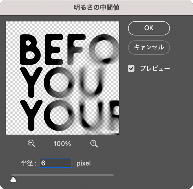文字に質感を加えていく。まず、文字のレイヤーが選択された状態のまま、フィルターメニュー→“ノイズ”→“明るさの中間値...”を[半径:6pixel]で適用して文字の角を丸める(図15)(図16)。