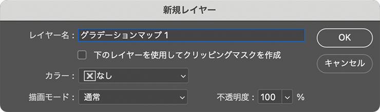 続いて、レイヤーメニュー→“新規調整レイヤー”→“グラデーションマップ...”を選択。「新規レイヤー」ダイアログが表示されるので、そのまま[OK]をクリックする(図3)(図4)。
