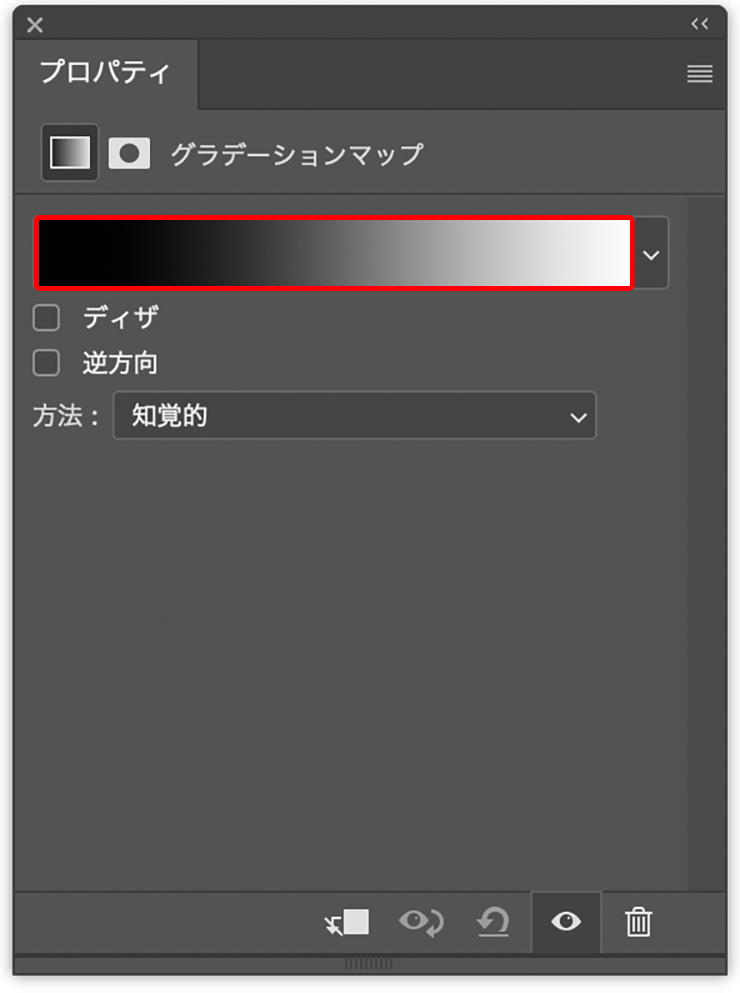 次にプロパティパネルのグラデーションサンプル(マウスポインターを合わせると「クリックでグラデーションを編集」とヒントが表示されるバー状のグラデーション見本)をクリックして(図5)、グラデーションエディターを開く。