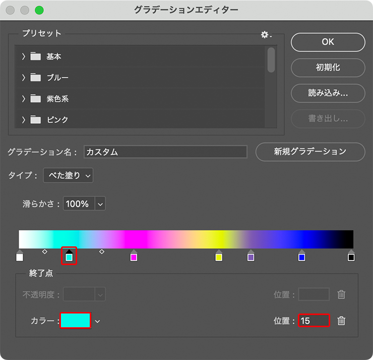 グラデーションエディターが表示されたら、グラデーションサンプルのカラー分岐点を設定して白、水色、ピンク、黄色、紫、青、黒のグラデーションを作成して適用する(図6)(図7)。