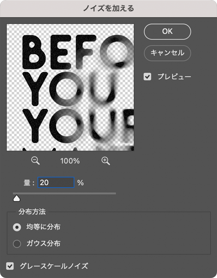 続いて、フィルターメニュー→“ノイズ”→“ノイズを加える...”を、[量:20%]、[分布方法:均等に分布]、[グレースケールノイズ]にチェックを入れて適用すれば完成(図17)(図18)。
