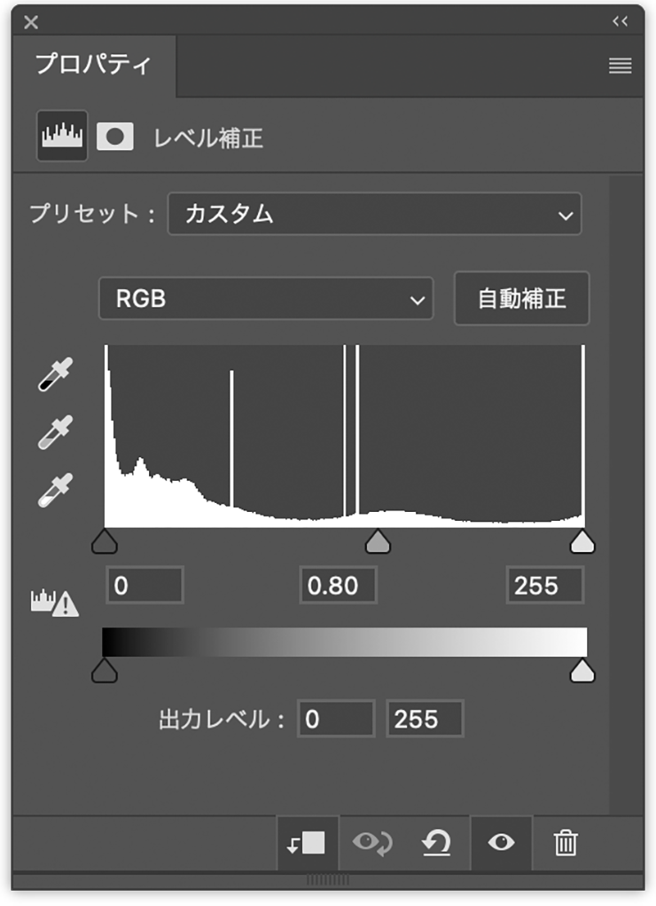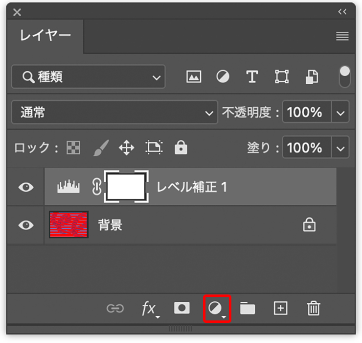 次に、レイヤーパネル下部の[塗りつぶしまたは調整レイヤーを新規作成]ボタンをクリックし、表示されるメニューから“レベル補正...”を選択(図13)。プロパティパネルで中間調のスライダーを動かしてコントラストを強める(図14)(図15)。