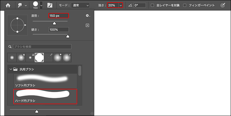 ボーダー柄に模様を描いていく。レイヤーメニュー→“画像を統合”を実行したら(図8)、指先ツールを選び、オプションバーでブラシプリセットピッカーから[ハード円ブラシ]を選択して[直径:150px]に変更。さらに[強さ:20%]に設定しておく(図9)。