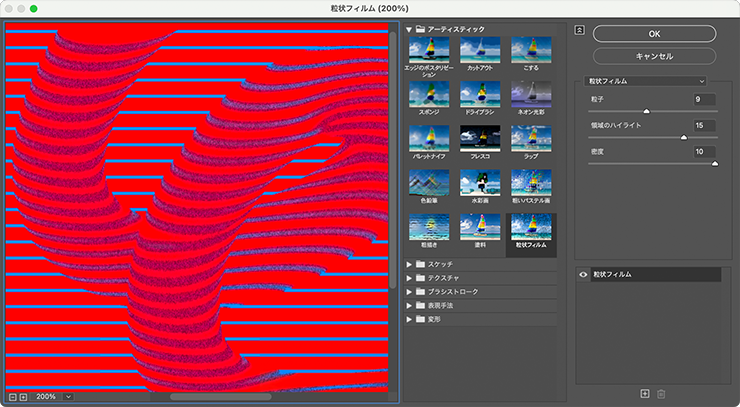 グラフィックに質感を加えていく。まず、フィルターメニュー→“フィルターギャラリー...”を選び、[アーティスティック]の[粒状フィルム]を[粒子:9]、[領域のハイライト:15]、[密度:10]で適用する(図11)(図12)。