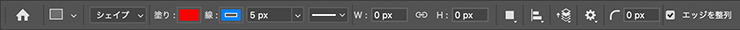 まずは新規ファイルを[幅:1200ピクセル]、[高さ:800ピクセル]、[解像度:350ピクセル/インチ]で作成したら、長方形ツールを選択してオプションバーで[ツールモード:シェイプ]、[塗り]を赤(ここでは16進数カラーコード[#ff0000])、[線]を青(ここでは16進数カラーコード[#007eff])、[線幅:5px]、[線の種類]を実線に設定(図1)。