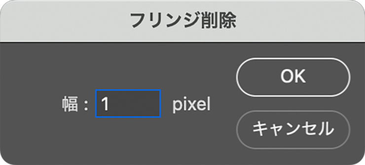 続いて、レイヤーメニュー→“マッティング”→“フリンジ削除...”を[幅:1pixel]で適用(図4)。これで被写体を切り抜いた際に輪郭部分に残った余分なピクセル(フリンジ)を除去することができる(図5)(図6)。