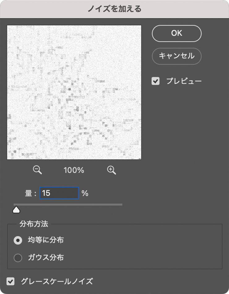 さらにフィルターメニュー→“ノイズ”→“ノイズを加える...”を[量:15%]、[分布方法:均等に分布]、[グレースケールノイズ]で適用する(図25)(図26)。