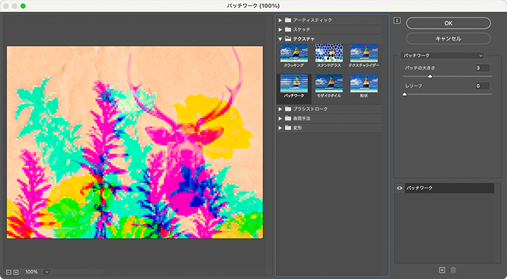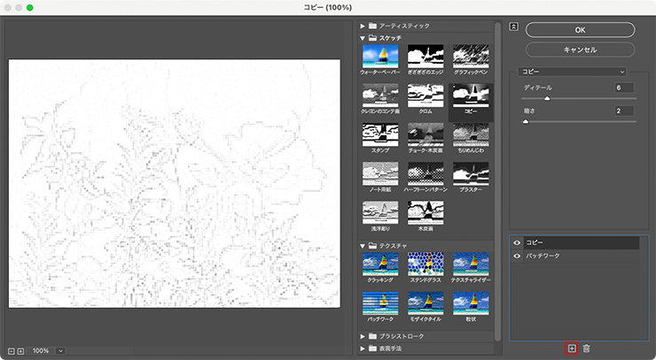 次に、レイヤーパネルで背景レイヤーを複製したら、複製した方のレイヤーを選択して[描画色]を黒、[背景色]を白に設定。フィルターメニュー→“フィルターギャラリー...”を選択し、[テクスチャ]の[パッチワーク]を[パッチの大きさ:3]、[レリーフ:0]に設定(図20)。さらに[新しいエフェクトレイヤー]をクリックしてエフェクトレイヤーを追加し、[スケッチ]の[コピー]を[ディテール:6]、[暗さ:2]に設定して適用する(図21)(図22)。