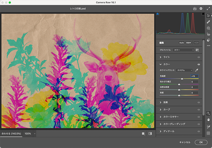 ビジュアルに質感をつけていく。まず、レイヤーメニュー→“画像を統合”を実行してすべてのレイヤーを背景レイヤーにまとめたら、フィルターメニュー→“Camera Raw フィルター...”を選択。[カラー]タブの[色温度]を調整して色みを整えたあと(図16)、[ライト]タブの各スライダーを調整して明るさやコントラストなどを上げ(図17)、[効果]タブの各スライダーを調整して紙の質感を引き立たせる(図18)(図19)。