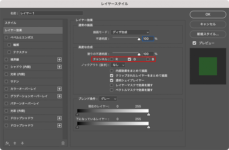 各写真素材を単色に変換していく。まずレイヤーパネルで先ほど配置した切り抜き写真のレイヤーのうち、いずれかひとつ(ここでは最初に配置した植物のレイヤー)を選択したら、レイヤーメニュー→“レイヤースタイル”→“レイヤー効果...”を選び、[チャンネル]の[R]と[B]のチェックを外し[G]のみ残して適用(図9)(図10)。