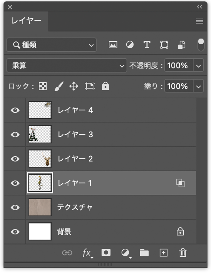 そのほかの写真素材も、同様の手順で[チャンネル]をいずれか一色のみ残した状態にして(図13)、レイヤーを[描画モード:乗算]に変更する(図14)。