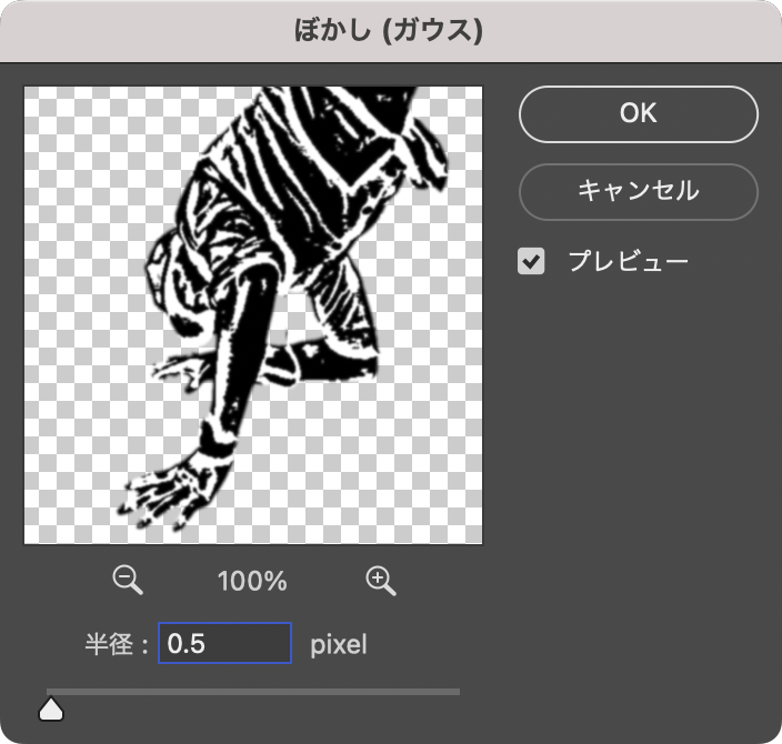 ビジュアルを仕上げていく。まずレイヤーパネルで人物写真のレイヤーが選択された状態のまま、フィルターメニュー→“ぼかし”→“ぼかし(ガウス)...”を[半径:0.5pixel]程度で適用する(図14)(図15)。