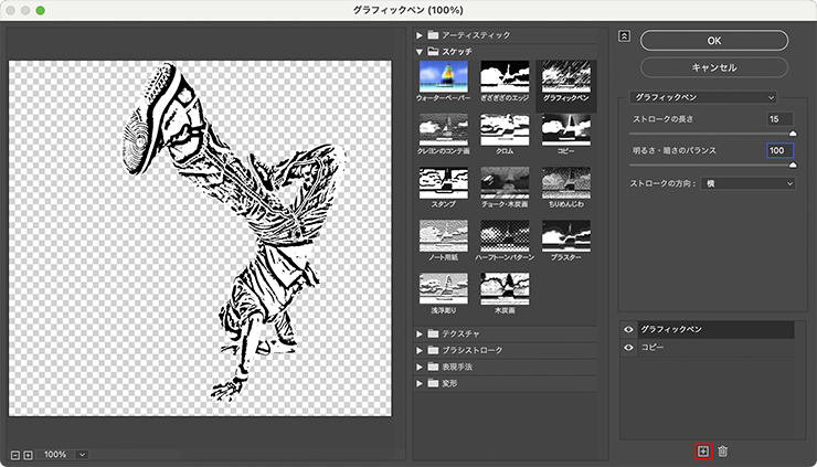 続いてダイアログ右下の[+]ボタンをクリックしてエフェクトレイヤーを追加し、[スケッチ]の[グラフィックペン]を[ストロークの長さ:15]、[明るさ・暗さのバランス:100]、[ストロークの方向:横]に変更して適用する(図9)(図10)。