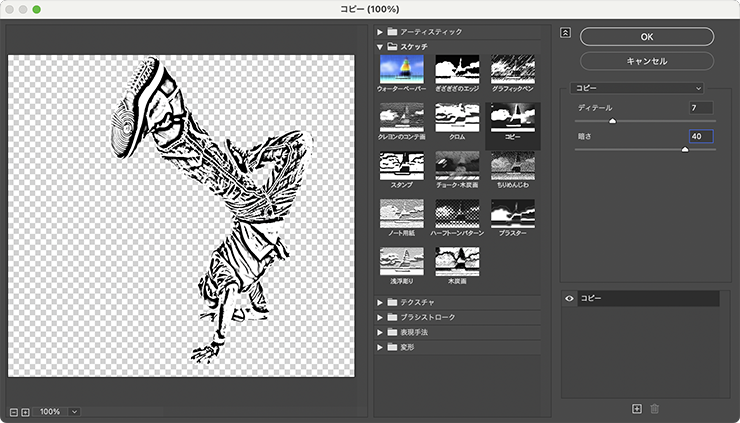 写真をチョーク風イラストに加工していく。まず[描画色]を黒、[背景色]を白に設定したら、レイヤーパネルで人物写真のレイヤーが選択された状態のまま、フィルターメニュー→“フィルターギャラリー...”を選び、[スケッチ]の[コピー]を[ディテール:7]、[暗さ:40]に設定する(図8)。なお、写真素材や表現したいイメージによって最適な設定値は異なるのでプレビューを参考にしながら調整してみてほしい。