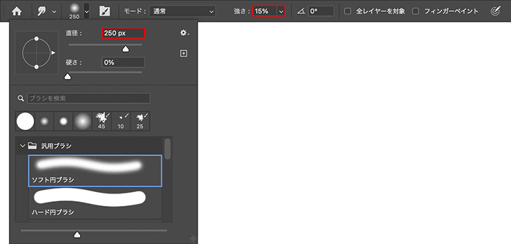 続いて、指先ツールを選択したら、オプションバーでブラシプリセットピッカーから[ソフト円ブラシ]を選択して[直径:250px]程度に変更し、[強さ:15%]に設定(図16)。