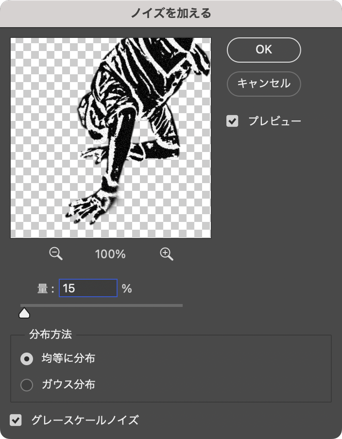 さらにフィルターメニュー→“ノイズ”→“ノイズを加える...”を[量:15%]、[分布方法:均等に分布]、[グレースケールノイズ]で適用する(図19)(図20)。