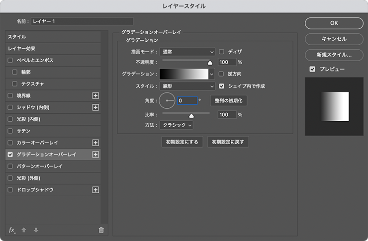 文字を立体的に表現していく。まず、文字の形に黒く塗りつぶしたレイヤーが選択された状態のまま、レイヤーメニュー→“レイヤースタイル”→“グラデーションオーバーレイ...”を選び、[描画モード:通常]、[不透明度:100%]、[グラデーション:黒、白]、[スタイル:線形]、[角度:0°]、[逆方向]はオフに設定(図11)。
