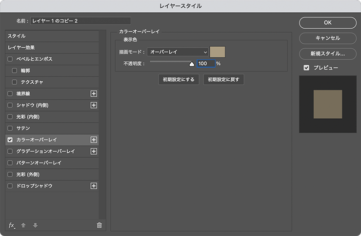 結合したレイヤーが選択された状態のまま、レイヤーメニュー→“レイヤースタイル”→“カラーオーバーレイ...”を選び、[描画モード:オーバーレイ]、[オーバーレイのカラー]を茶色(ここでは、16進数カラーコード[#aa9c81])[不透明度:100%]に設定して適用する(図22)(図23)。