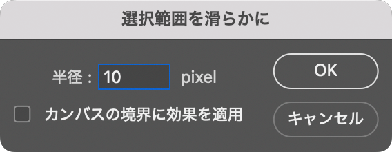 レイヤーパネルで文字のレイヤーを非表示にしたら、選択範囲メニュー→“選択範囲を変更”→“滑らかに...”を[半径:10pixel]、[カンバスの境界に効果を適用]はオフで適用する(図4)(図5)。