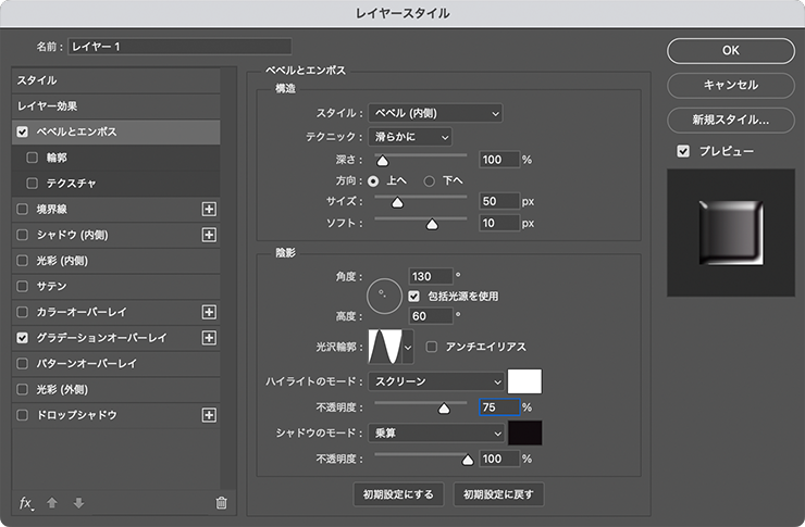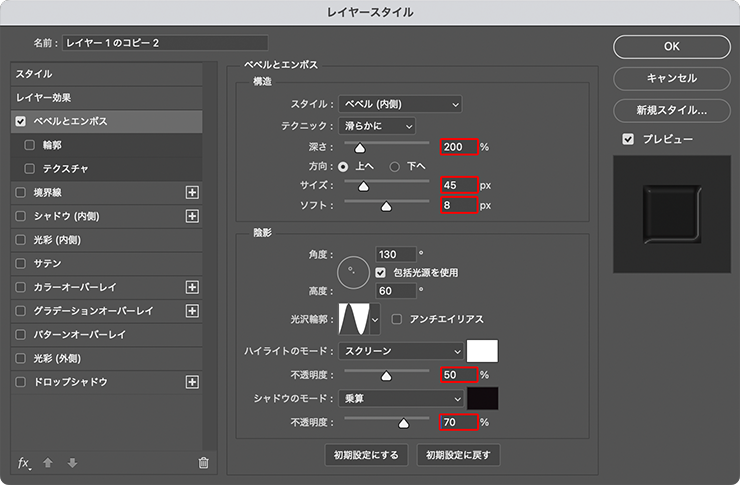 [ベベルとエンボス]の設定ダイアログが開くので、[深さ:200%]、[サイズ:45px]、[ソフト:8px]、ハイライトの[不透明度]を50%に、シャドウの[不透明度]を70%に変更して適用する(図19)(図20)。
