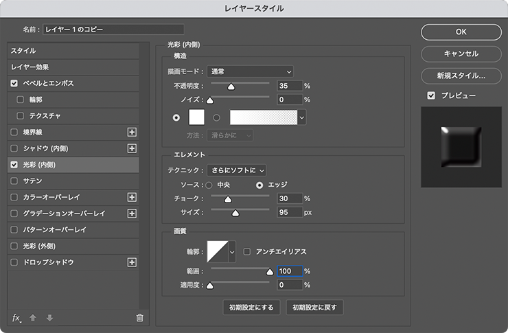 続いて、レイヤースタイルの[光彩(内側)]を選択したら、[描画モード:通常]、[不透明度:35%]、[ノイズ:0%]、[光彩のカラー:白]、[テクニック:さらにソフトに]、[ソース:エッジ]、[チョーク:30%]、[サイズ:95px]、[輪郭:線形]、[範囲:100%]、[適用度:0%]に設定して適用する(図16)(図17)。