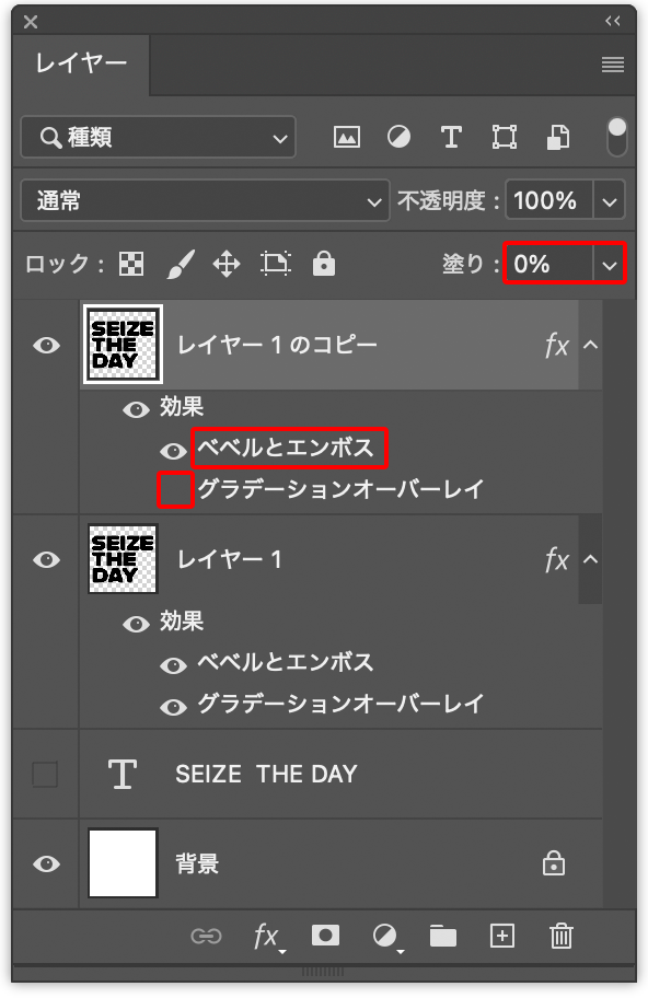 このレイヤーを前面に複製したら、レイヤーパネルで[塗り:0%]に変更し、レイヤー効果の[グラデーションオーバーレイ]を非表示にしておく。さらに、[ベベルとエンボス]をダブルクリックする(図14)。
