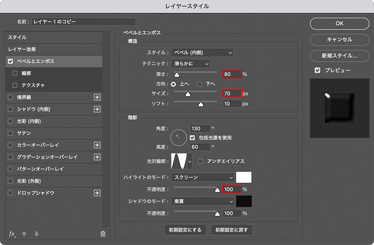 [ベベルとエンボス]の設定ダイアログが開くので、[深さ:80%]、[サイズ:70px]、ハイライトの[不透明度]を100%に変更する(図15)。