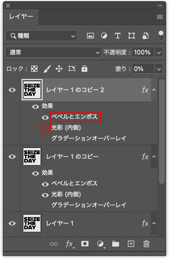 このレイヤーを前面に複製したら、レイヤーパネルでレイヤー効果の[光彩(内側)]を非表示にし、[ベベルとエンボス]をダブルクリック(図18)。