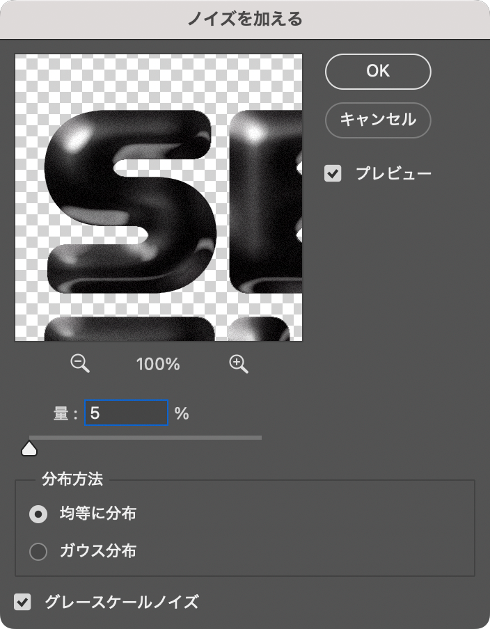 続いて、フィルターメニュー→“ノイズ”→“ノイズを加える…”を[量:5%]、[分布方法:均等に分布]、[グレースケールノイズ]で適用する(図24)(図25)。
