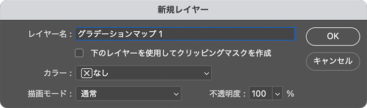 ロゴを仕上げていく。まずは、レイヤーメニュー→“新規調整レイヤー”→“グラデーションマップ...”を選択。「新規レイヤー」ダイアログが表示されるので、そのまま[OK]をクリックする(図9)(図10)。