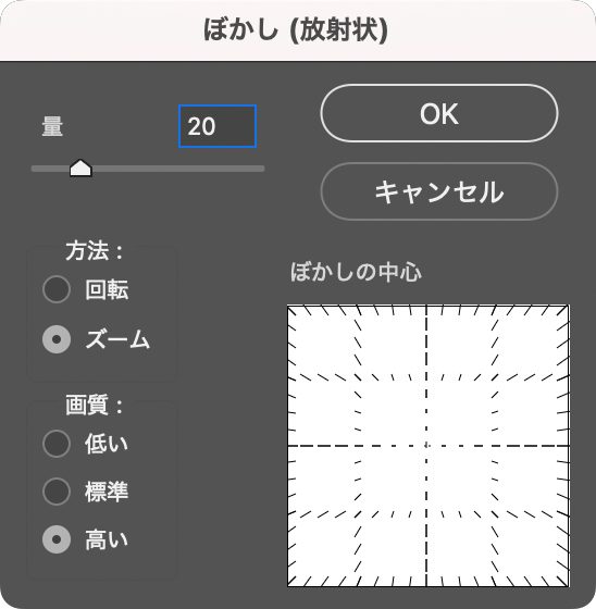 続いて、フィルターメニュー→“ぼかし”→“ぼかし(放射状)...”を、[量:20]、[方法:ズーム]、[画質:高い]で実行する(図7)(図8)。