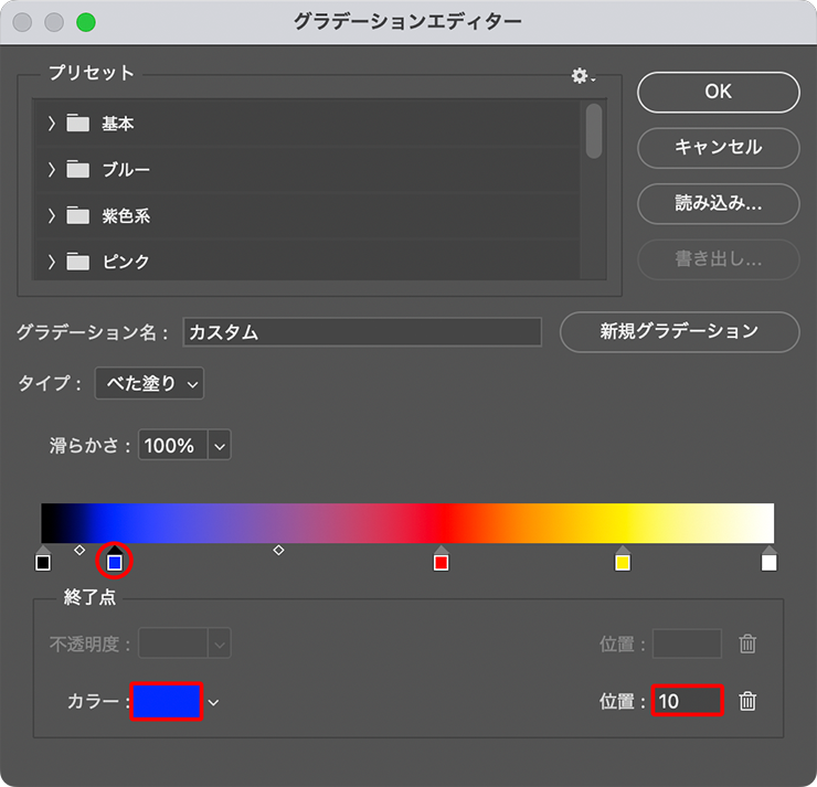 グラデーションエディターが表示されたら、グラデーションサンプルのカラー分岐点を設定して黒、青、赤、黄色、白のグラデーションを作成して適用する(図12)(図13)。